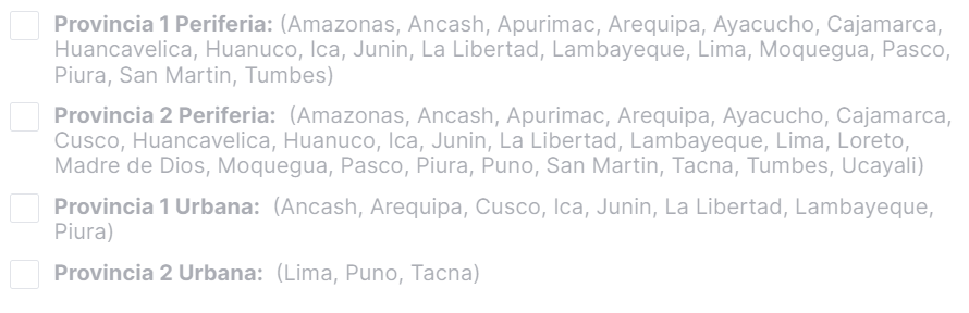 El seller puede seleccionar entre las siguientes zonas para su cobertura Lima y/o provincia. La selección de la zona es completa, no se pueden excluir distritos específicos de una zona.